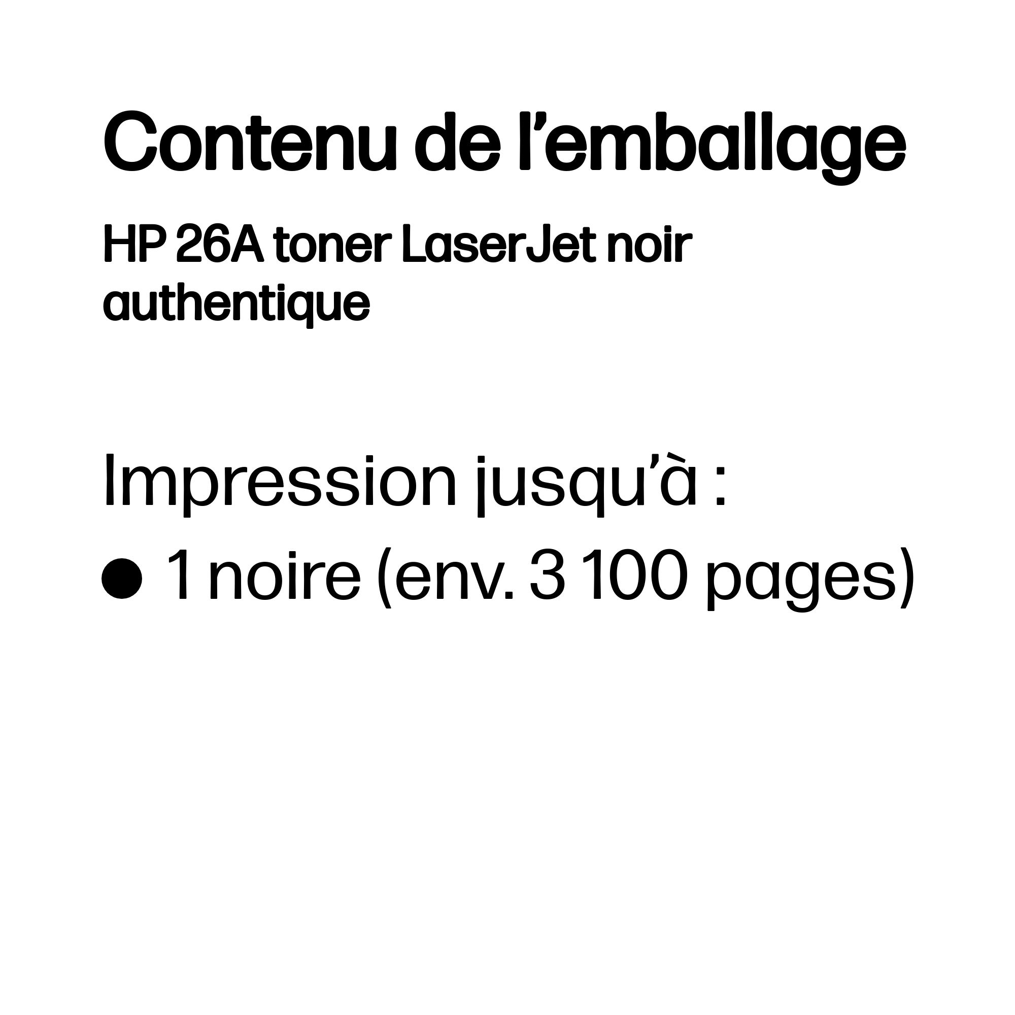 | Compatibilité | Les cartouches de toner HP 26 fonctionnent avec : HP LaserJet Pro M402, M426 |