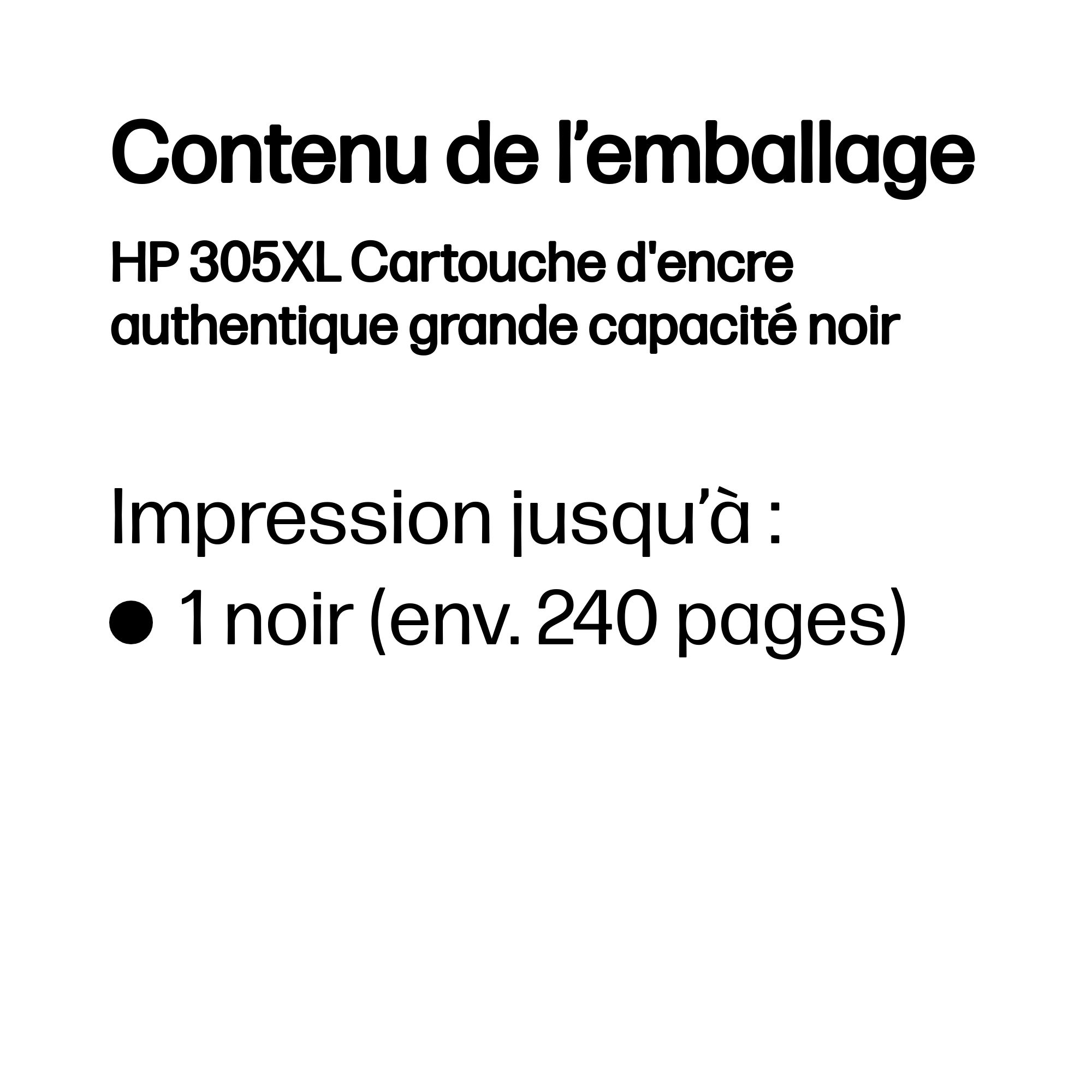 | Contenu de la boîte | Cartouche d’encre noire capacité intermédiaire HP 305XL authentique |