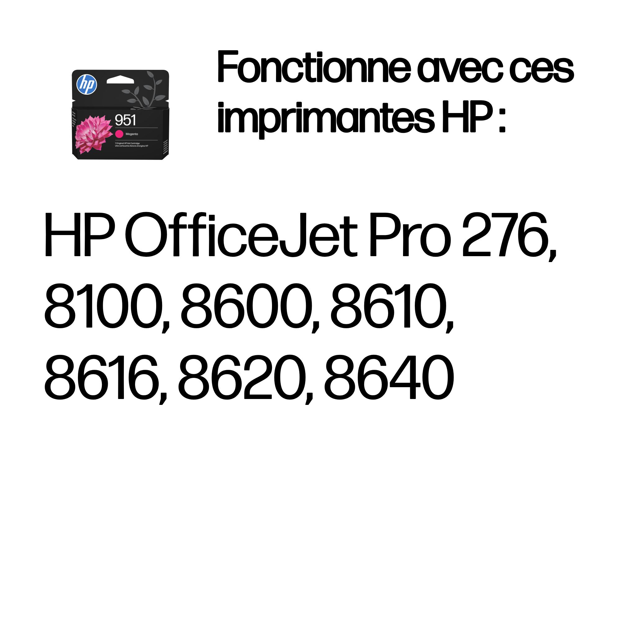 | Compatibilité | Les cartouches d'encre HP 951 fonctionnent avec : HP OfficeJet Pro 276, 8100, 8600, 8610, 8616, 8620, 8640 |