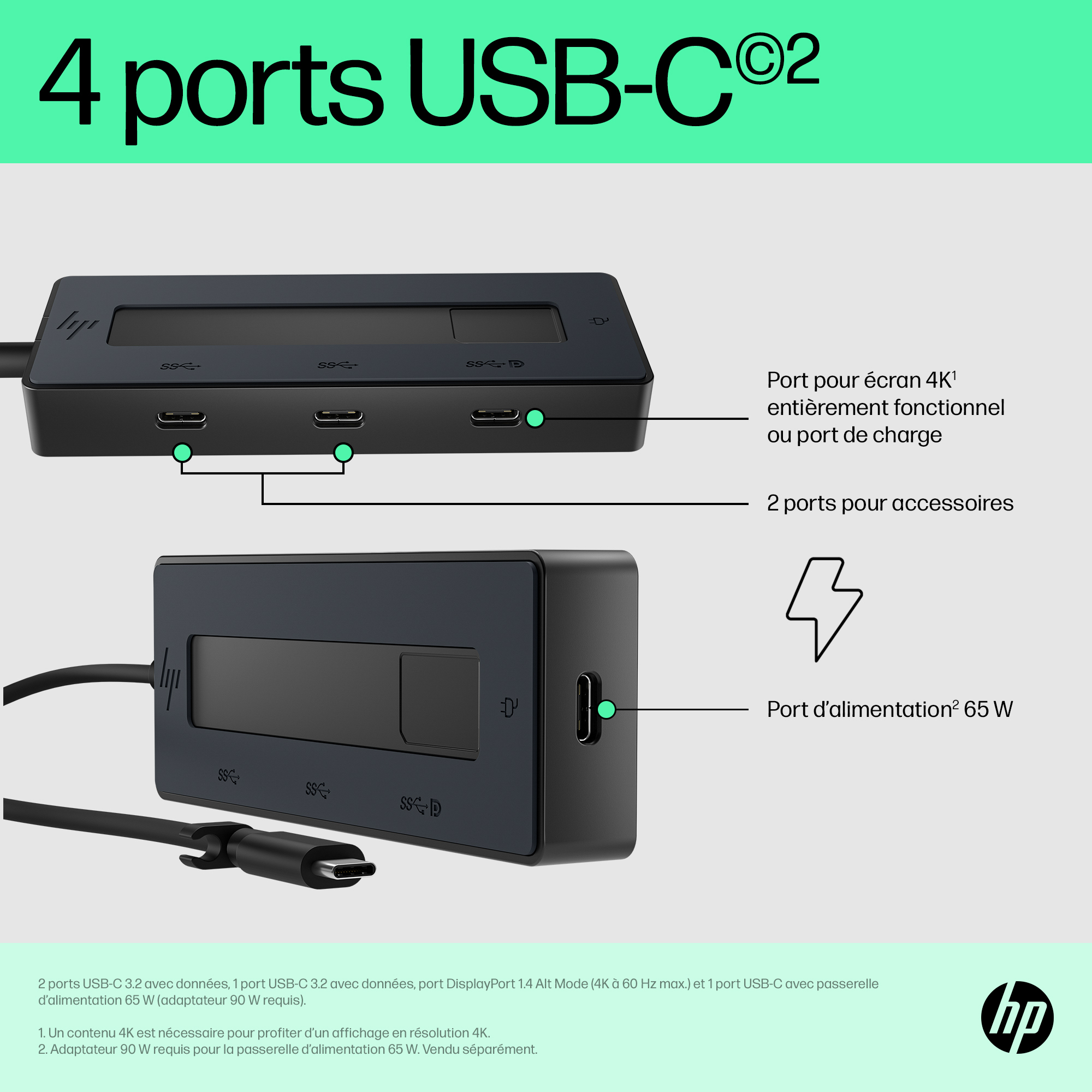 L’USB-C® est le port par excellence. Ce concentrateur dispose de 4 ports USB-C®<sup>[2]</sup> très polyvalents dans un seul boîtier compact : un port 65 W<sup>[3]</sup> pour alimenter votre ordinateur portable, deux ports pour connecter et charger vos accessoires et un autre port pour charger ou brancher votre écran 4K<sup>[4]</sup> avec fonctionnalité complète.
