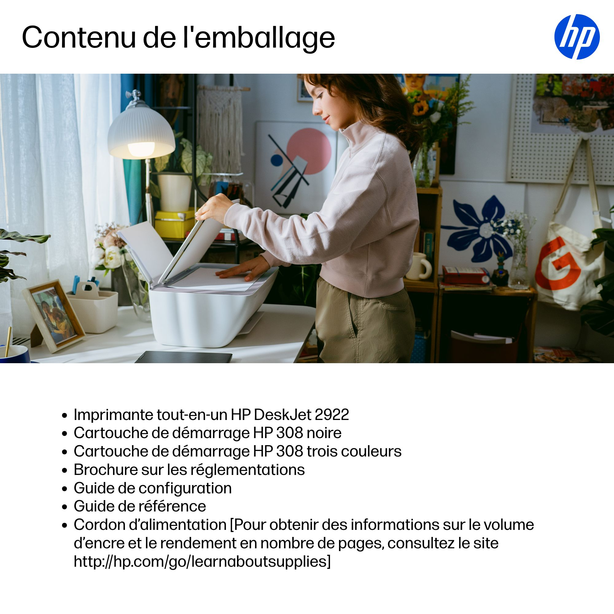 | Contenu de la boîte | Imprimante tout-en-un HP DeskJet 2922; Cartouche de démarrage HP 308 noire; Cartouche de démarrage HP 308 trois couleurs; Brochure sur les réglementations; Guide de configuration; Guide de référence; Cordon d’alimentation [Pour obtenir des informations sur le volume d’encre et le rendement en nombre de pages, consultez le site http://hp.com/go/learnaboutsupplies] |