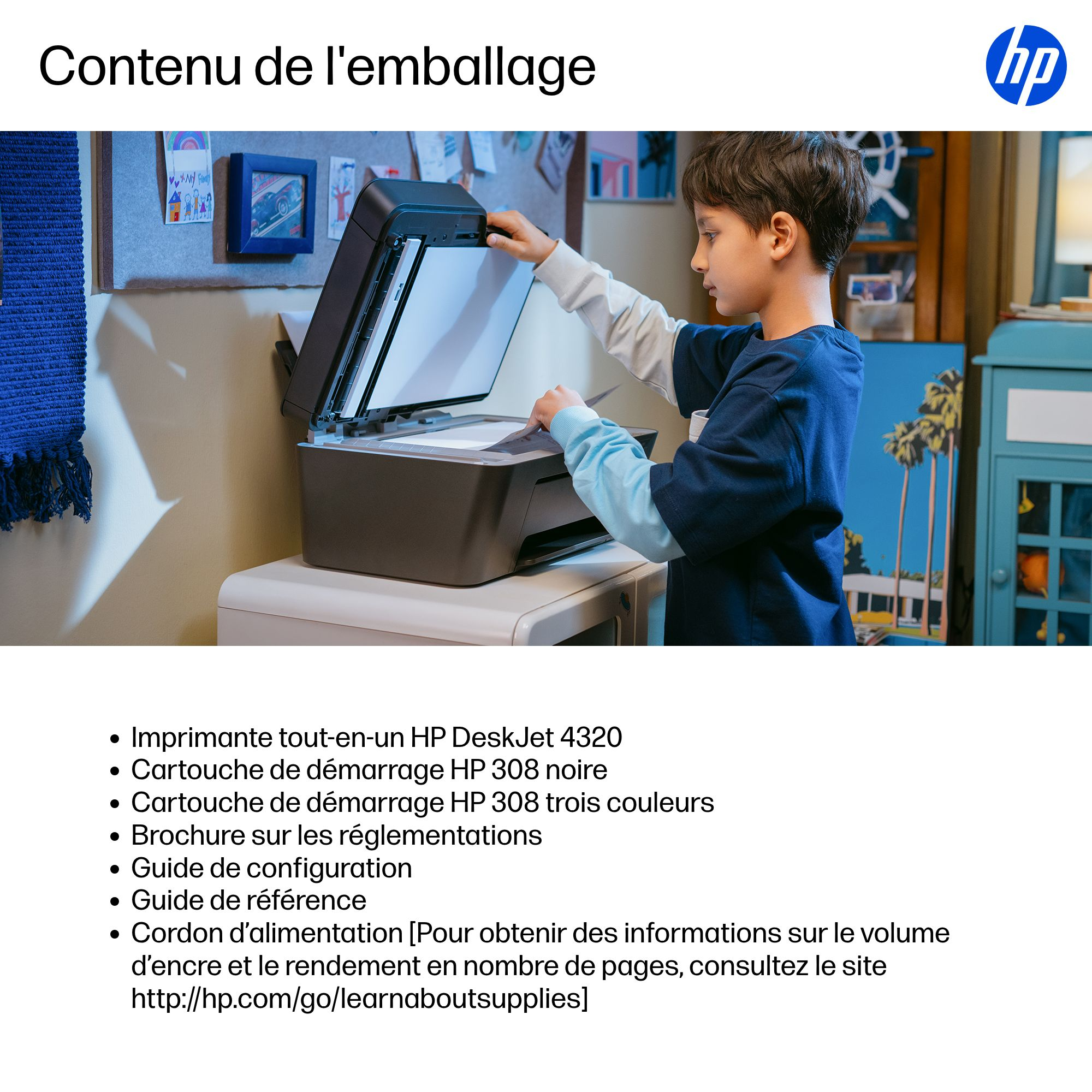| Contenu de la boîte | Imprimante tout-en-un HP DeskJet 4320; Cartouche de démarrage HP 308 noire; Cartouche de démarrage HP 308 trois couleurs; Brochure sur les réglementations; Guide de configuration; Guide de référence; Cordon d’alimentation [Pour obtenir des informations sur le volume d’encre et le rendement en nombre de pages, consultez le site http://hp.com/go/learnaboutsupplies] |