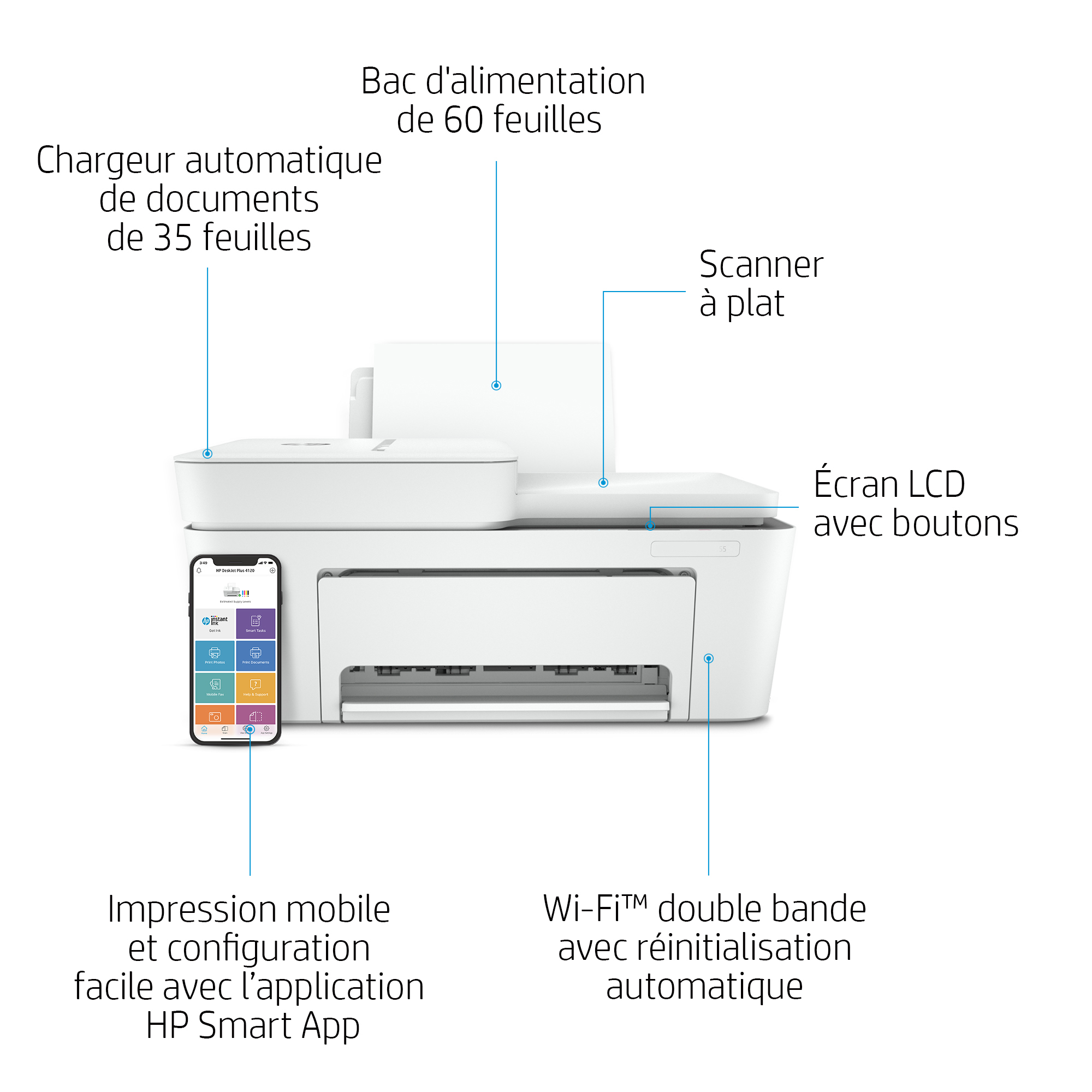 Avec l'application HP Smart, imprimez vos documents quotidiens, bénéficiez d'une numérisation et d'un partage de haute qualité, et faites facilement des copies, tout cela depuis votre téléphone.<sup>[2]</sup>