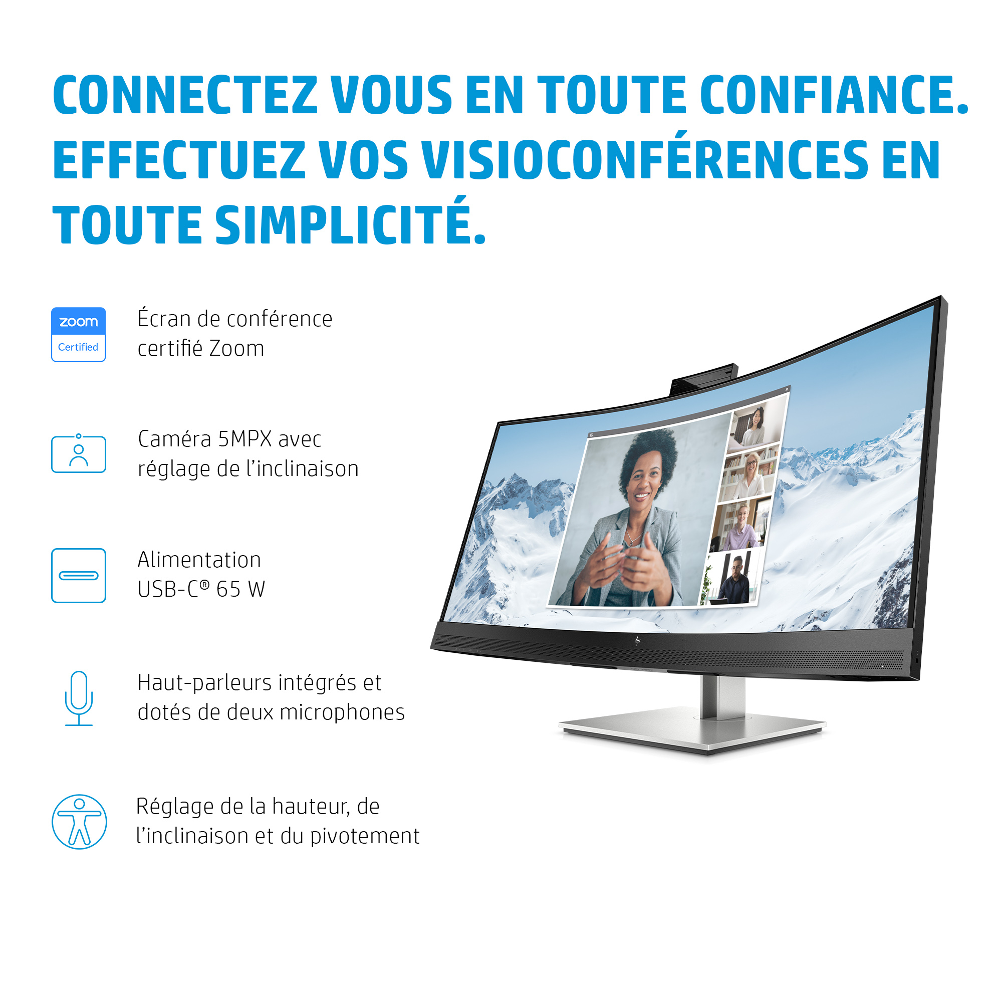 Assistez à vos conférences et connectez-vous facilement avec l’écran de conférence HP E34m G4 USB-C certifié Zoom, doté d’une webcam intégrée de 5 MP à inclinaison réglable, de haut-parleurs en façade et de deux micros. Travaillez sans effort et simplifiez votre configuration avec un seul câble USB-C[1] qui se charge des données, de la vidéo et recharge votre ordinateur avec maximum 65 W.