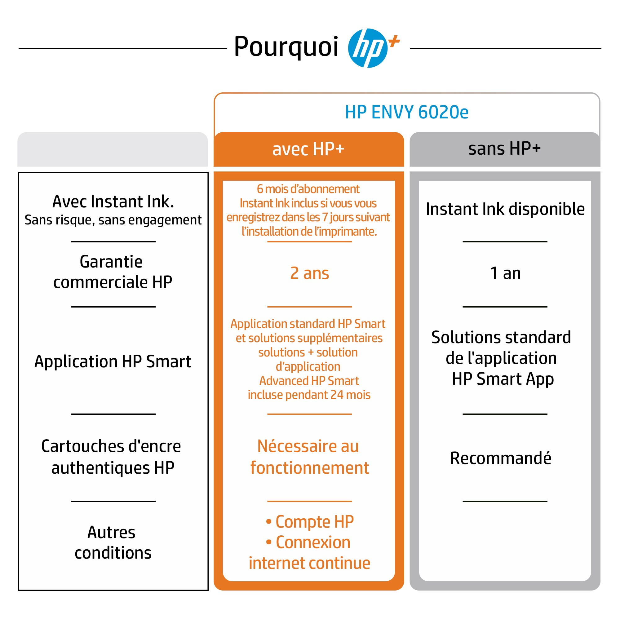 Cette imprimante est compatible HP+. Choisissez HP+ lors de la configuration du produit et profitez de nombreux avantages. HP+ nécessite un compte HP, une connexion Internet active et l’utilisation exclusive de cartouches d’encre HP authentiques tout au long de la vie de l’imprimante. Informations supplémentaires: http://www.hp.com/plus