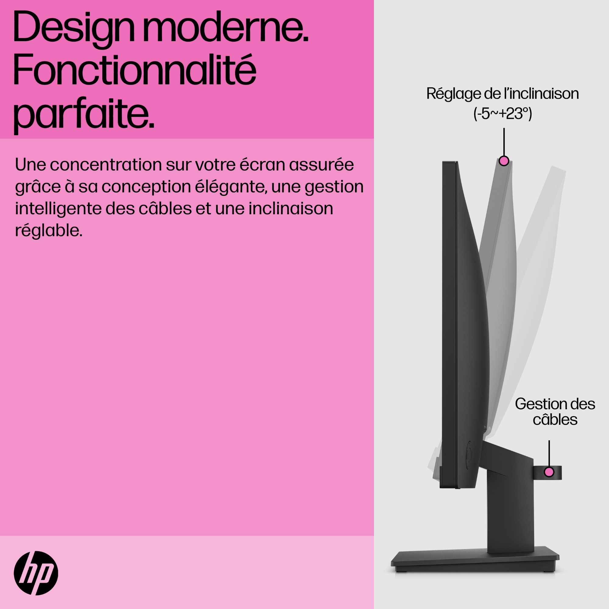 Libérez votre esprit et dégagez votre bureau avec un écran conçu pour travailler dans n’importe quel espace. Restez concentré sur votre écran doté d’un cadre élégant à micro-bords sur 3 côtés, d’une gestion ordonnée des câbles et d’un socle ultra-plat avec un réglage en inclinaison pour un point de vue parfait.