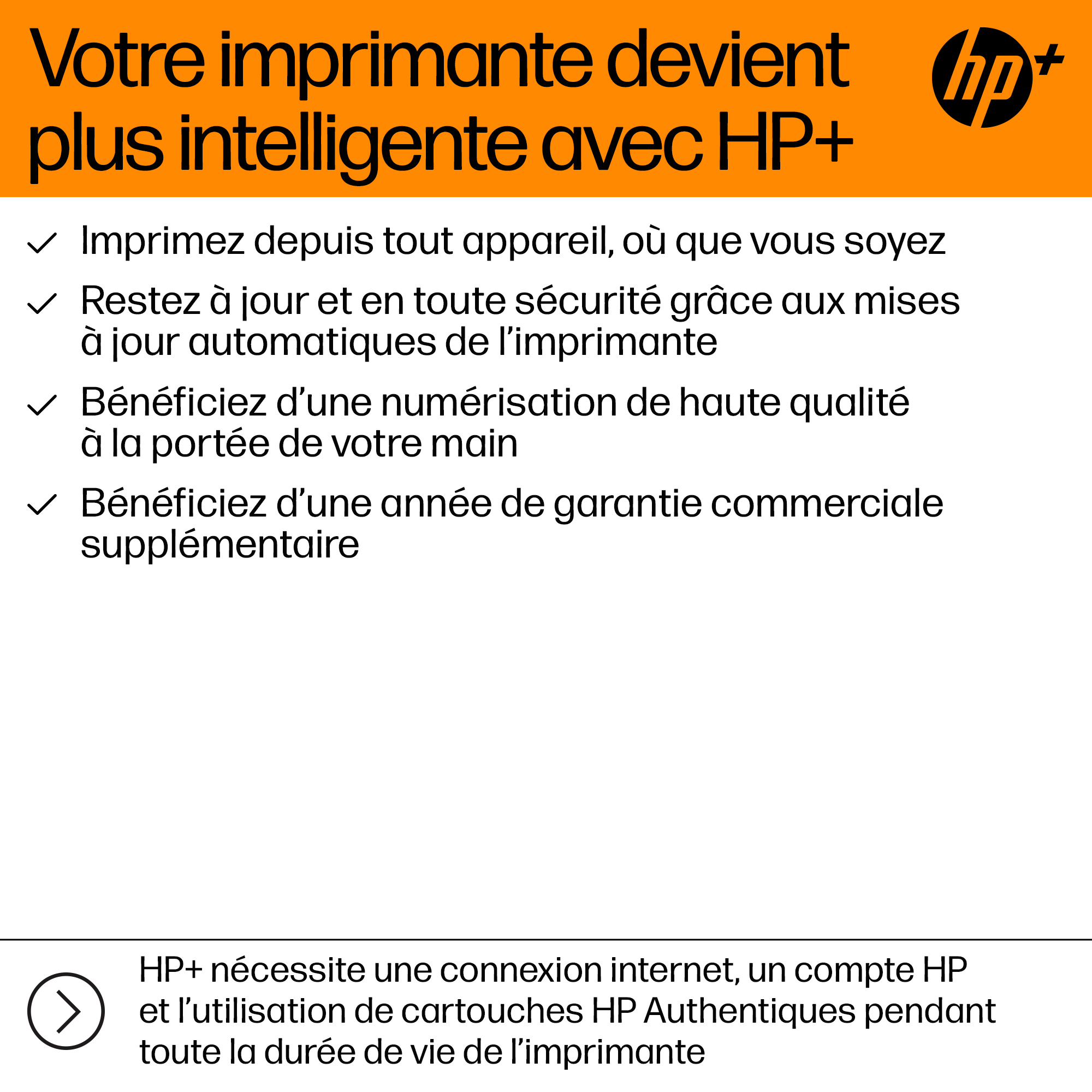 Cette imprimante est compatible HP+. Choisissez HP+ lors de la configuration du produit et profitez de nombreux avantages. HP+ nécessite un compte HP, une connexion Internet active et l’utilisation exclusive de cartouches d’encre HP authentiques tout au long de la vie de l’imprimante. Informations supplémentaires: http://www.hp.com/plus