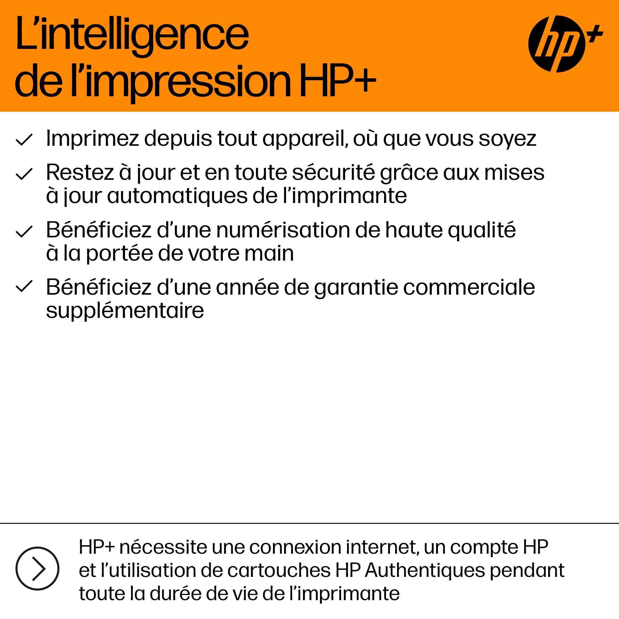 Cette imprimante est compatible HP+. Choisissez HP+ lors de la configuration du produit et profitez de nombreux avantages. HP+ nécessite un compte HP, une connexion Internet active et l’utilisation exclusive de cartouches d’encre HP authentiques tout au long de la vie de l’imprimante. Informations supplémentaires: http://www.hp.com/plus