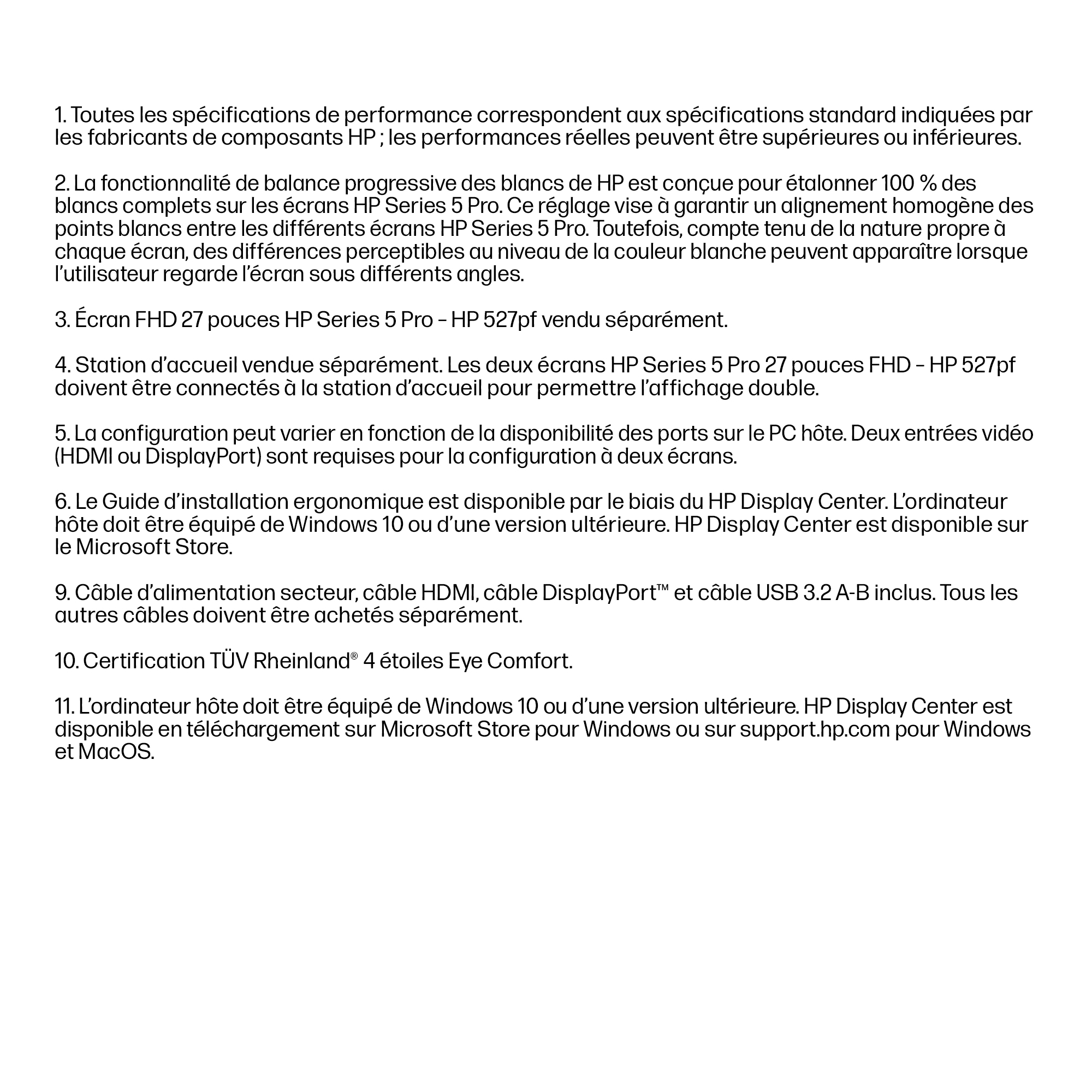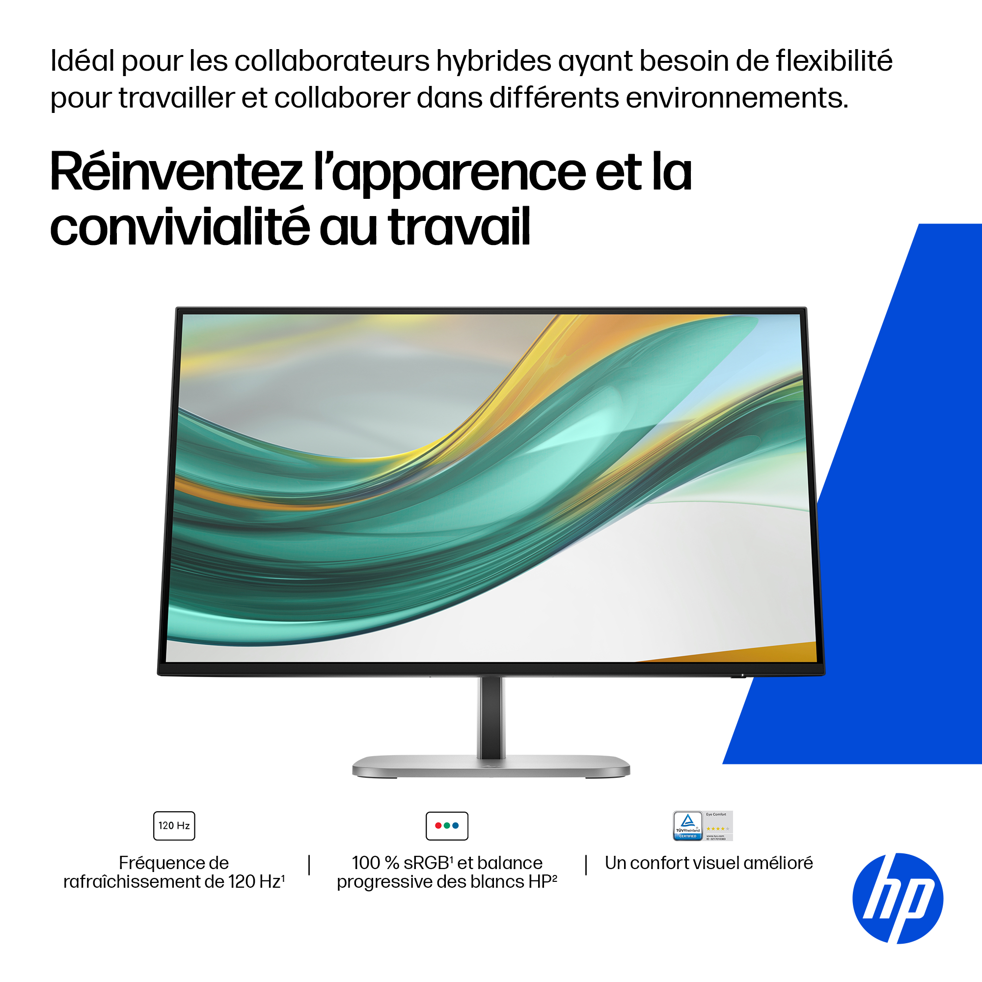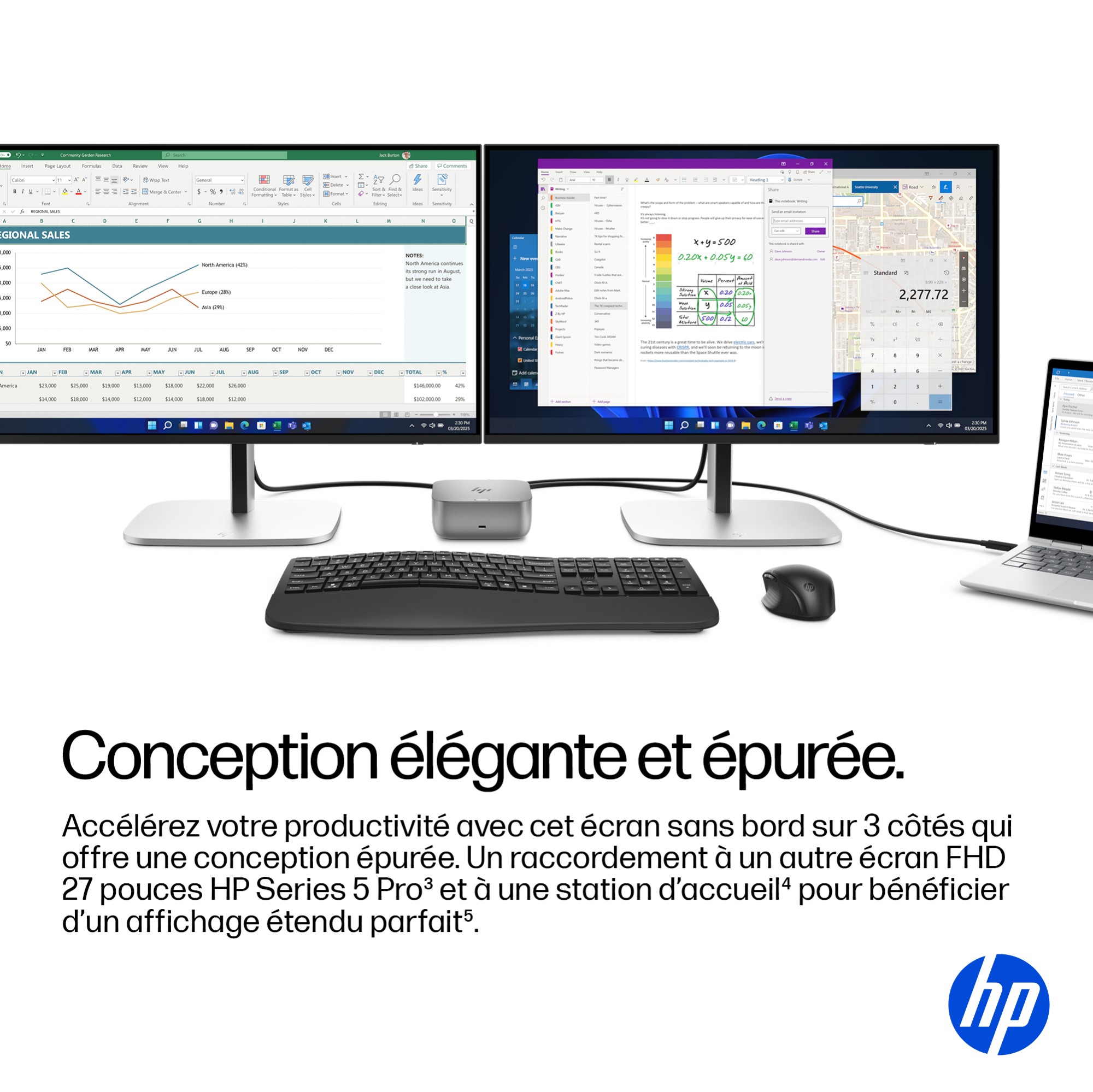 Changez votre regard sur votre bureau. Agrandissez votre espace d’affichage grâce à un cadre à micro-bords sans bord sur 3 côtés. Pour optimiser votre productivité, associez cet écran à un autre moniteur FHD 27 pouces HP Series 5 Pro[3] et à une station d’accueil[4] afin de bénéficier d’une configuration à deux écrans[5].