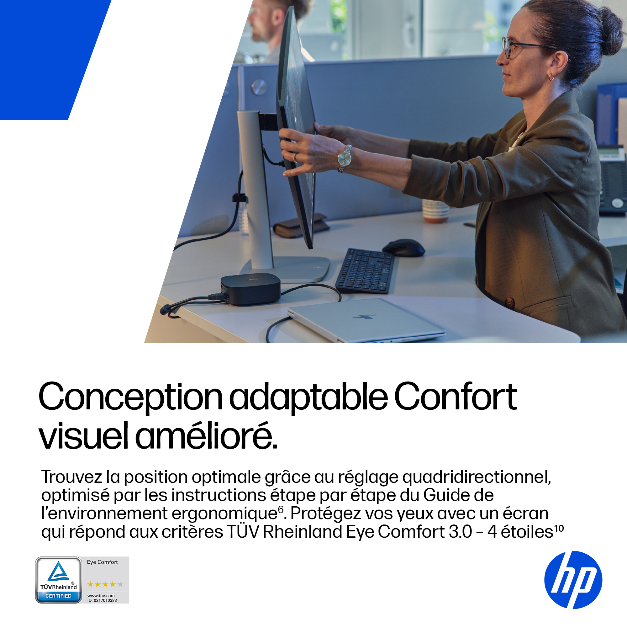 Une ergonomie optimale du bout de doigts : grâce au réglage quadridirectionnel de votre écran et au Guide de confort ergonomique (disponible via HP Display Center), travaillez confortablement tout au long de la journée.[6,11]