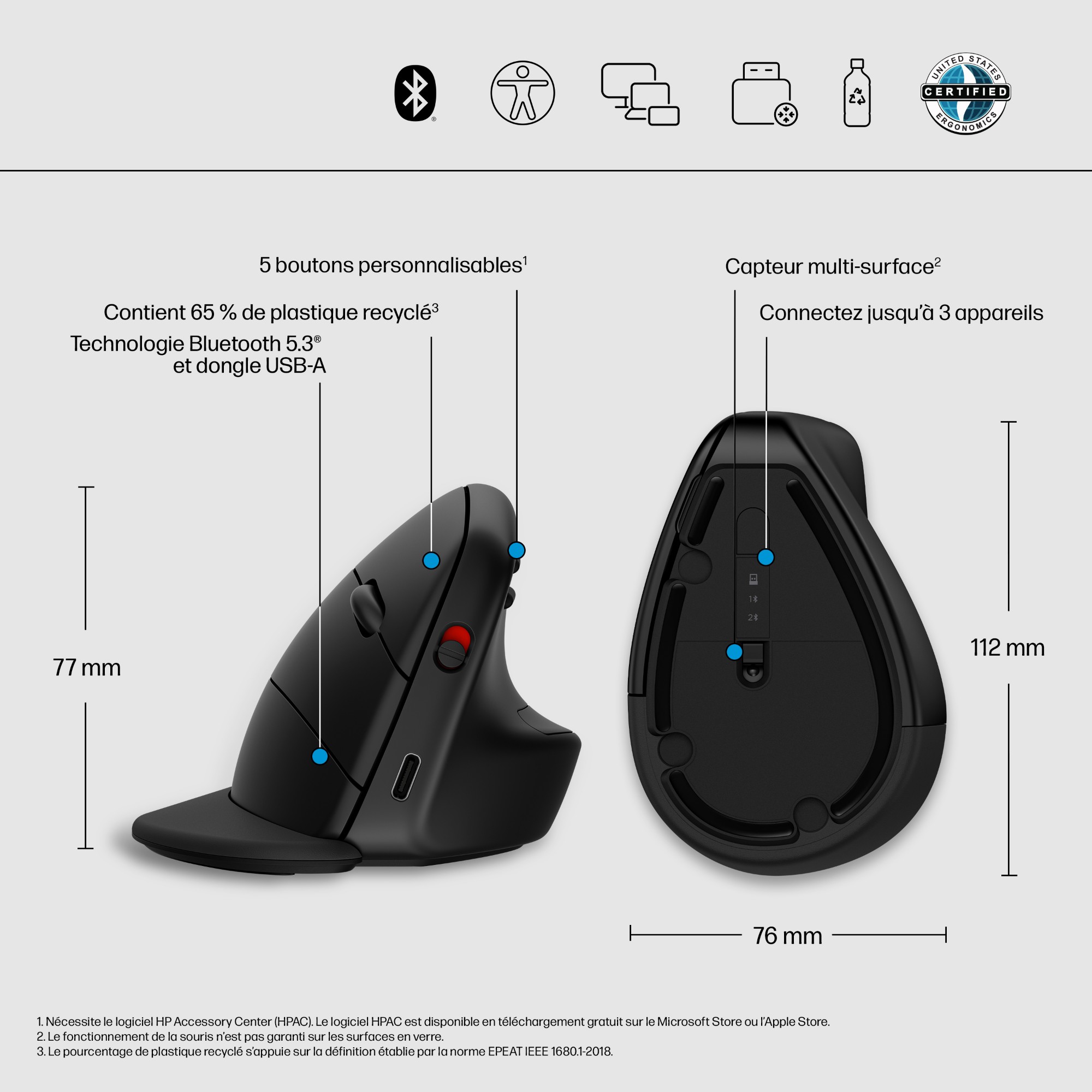PC portable, ordinateur de bureau ou tablette : cette souris ergonomique peut se connecter jusqu’à trois appareils simultanément grâce au récepteur USB HP ou par Bluetooth® 5.3. Basculez en toute transparence entre vos appareils Windows®, Apple et ChromeOS. Pour passer à un autre appareil, rien de plus simple : une simple pression d’un bouton suffit.