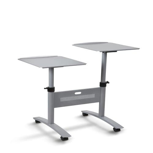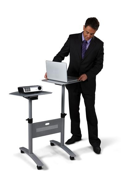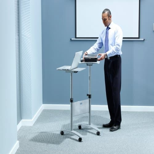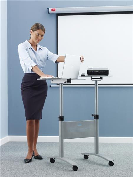Cette table multimédia robuste est dotée de deux tablettes séparées afin de poser à la fois un ordinateur portable et un projecteur. Les deux tablettes s´inclinent et pivotent à 360° afin d´obtenir l´angle de projection parfait. La charge maximale de chaque tablette est de 10 kg alors que la hauteur se règle de 81 à 120 cm.