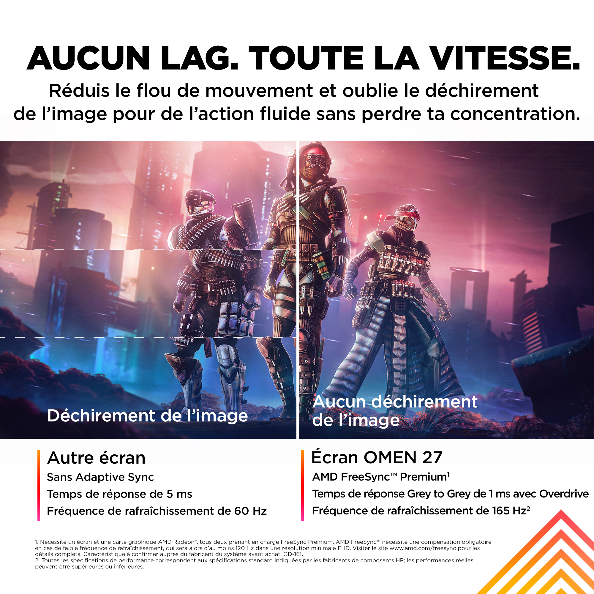Jouez au plus près de l’action. Capturez tous les détails avec un écran offrant un taux de rafraîchissement de 165 Hz et un temps de réponse GTG de 1 ms avec Overdrive qui élimine le flou cinétique<sup>[1]</sup>. Dites adieu aux problèmes de tearing et de lag grâce à la technologie AMD FreeSync™ Premium<sup>[2]</sup>.